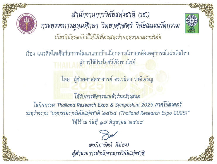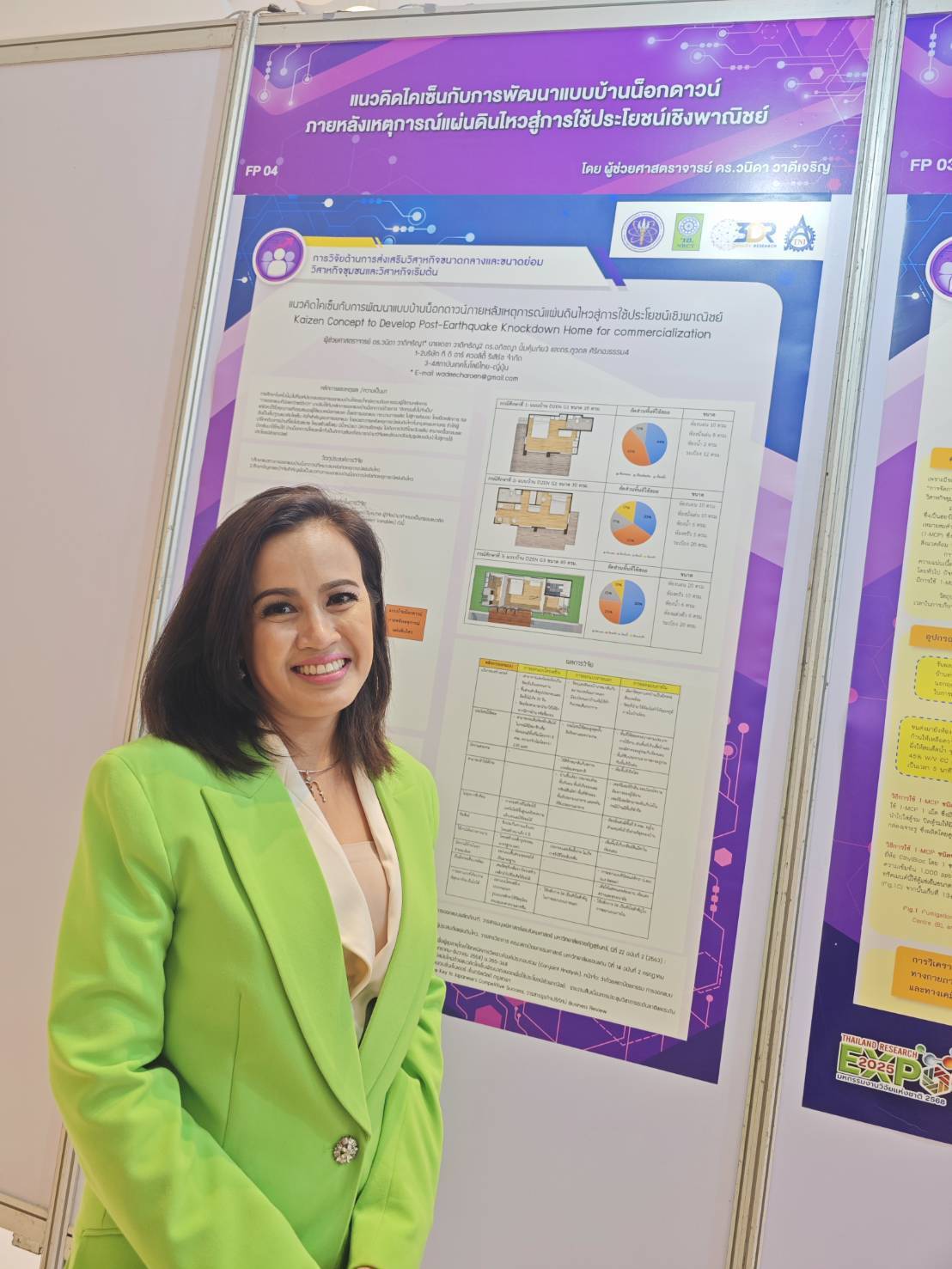 ผู้ช่วยศาสตราจารย์ ดร.วนิดา วาดีเจริญ กรรมการผู้จัดการบริษัท ที ดี อาร์ ควอลิตี้ รีเสิร์ช จำกัด และหัวหน้าโครงการวิจัยนำเสนอผลงานวิจัย เรื่อง “แนวคิดไคเซ็นกับการพัฒนาแบบบ้านน็อกดาวน์ภายหลังเหตุการณ์แผ่นดินไหวสู่การใช้ประโยชน์เชิงพาณิชย์” ร่วมกับ ดร.อภิชญา นิ้มคุ้มภัย และดร.ภูวดล ศิริกองธรรม คณาจารย์จากคณะเทคโนโลยีสารสนเทศ สถาบันเทคโนโลยีไทย-ญี่ปุ่น ในเวทีการนำเสนอผลงานวิชาการระดับชาติ Thailand Research Expo & Symposium 2025 ภาคโปสเตอร์ ระหว่างงาน มหกรรมงานวิจัยแห่งชาติ 2568 “Thailand Research Expo 2568” โดยสำนักงานการวิจัยแห่งชาติ (วช.) ระหว่างวันที่ 16-20 มิถุนายน 2568 ณ โรงแรมเซ็นทาราแกรนด์ และบางกอกคอนเวนชั่น เซ็นเตอร์ เซ็นทรัลเวิลด์ กรุงเทพฯ